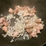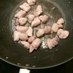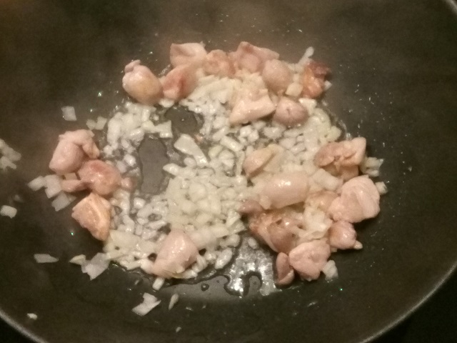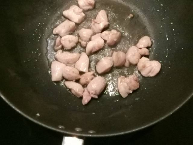 Verhit de olie in een wok of grote koekenpan en bak de kipblokjes gedurende een minuut of 4 aan alle kanten aan.