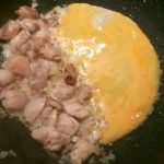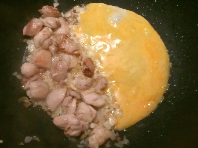 Breek de eieren in een kommetje en klop deze wat los met een vork. Schuif de inhoud van de pan aan de kant. Giet in het open gedeelte het ei en bak tot roerei. Meng het daarna met de rest van de inhoud.