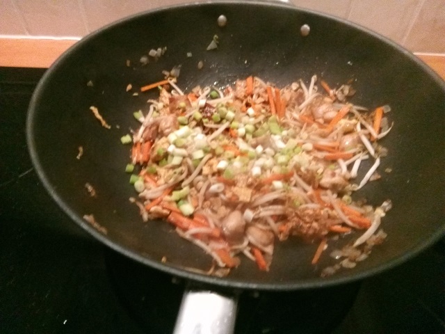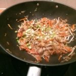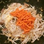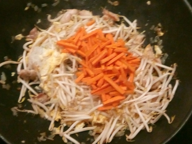 Voeg de noedels, de wortel en de taugé toe en bak deze een minuut of 5 mee.