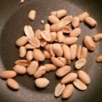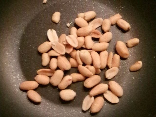 Rooster intussen in een ander koekenpannetje de pinda's. Snijd ze vervolgens fijn op een snijplank.