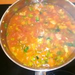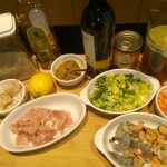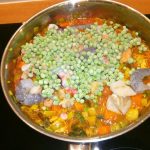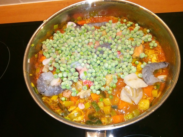 Voeg de vis, garnalen, zeevruchten en de doperwten toe. Doe het deksel op de pan en laat nog een minuut of 7 verder garen. Het gerecht is klaar als de rijst gaar is en de garnalen mooi roze zijn.