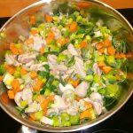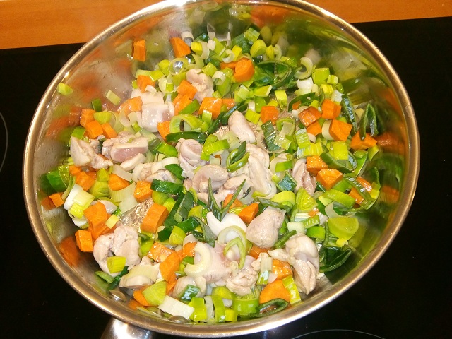 Zet alle ingrediënten klaar. Snijd de kippendijen in blokjes. Snijd de prei overlangs door en was de prei. Snijd daarna in halve ringetjes. Schil de wortel en snijd in blokjes. Pel de garnalen en verwijder het darmkanaaltje.