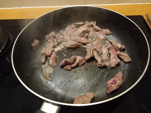 Verhit in een ruime koekenpan op middelhoge warmte1 el olie. Voeg de reepjes biefstuk toe en bak in 5-6 minuten aan alle zijden. Haal uit de pan en bewaar op een bordje. Is er veel vocht vrijgekomen bij het bakken, veeg dan de pan schoon met een stukje keukenpapier.