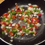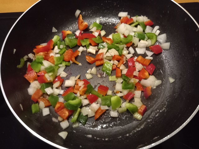 Verhit de 2e el olie in de pan en bak de ui en paprikastukjes gedurende 3-4 minuten tot ze zacht zijn.