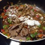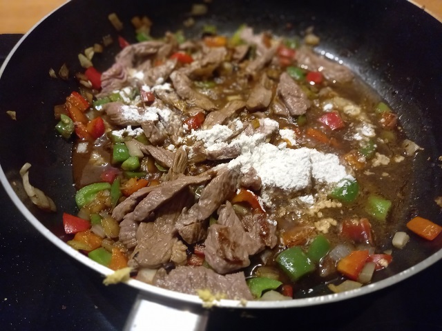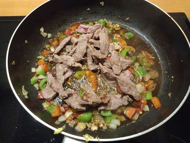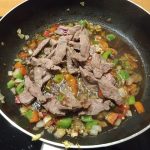 Voeg de biefstuk reepjes weer toe aan de pan. Warm goed door.