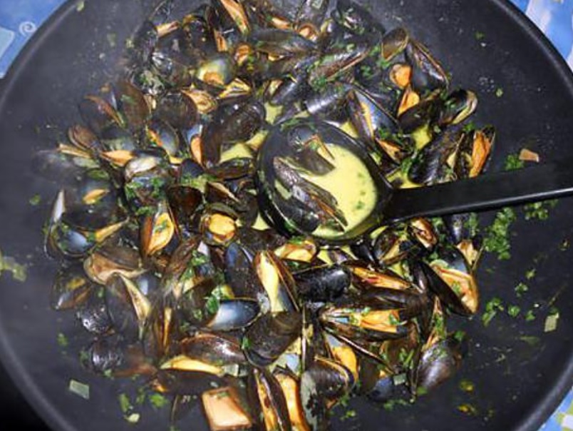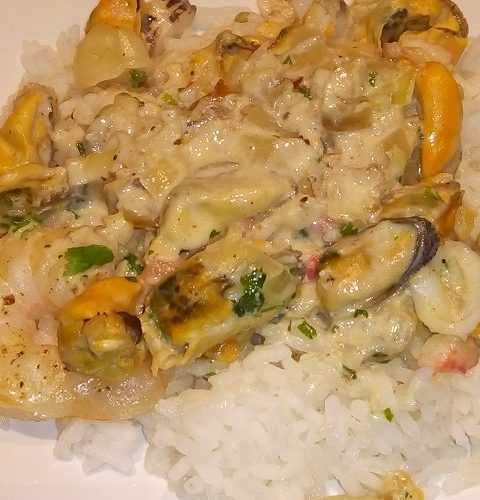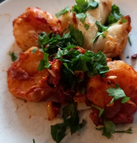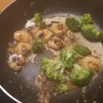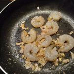 Ondertussen verhit de boter in een ruime koekenpan en fruit de sjalot. Zodra deze zacht begint te worden voeg dan de knoflook toe. Voeg dan de garnalen toe en bak deze aan beide zijden maar nog niet helemaal gaar.