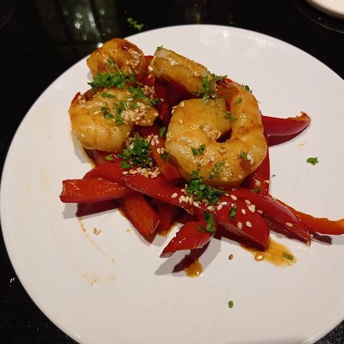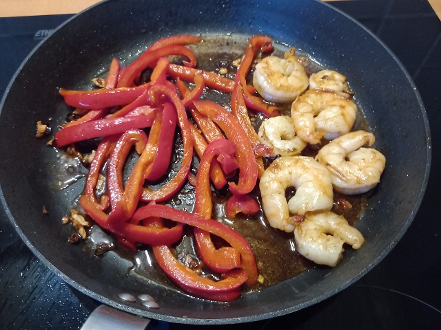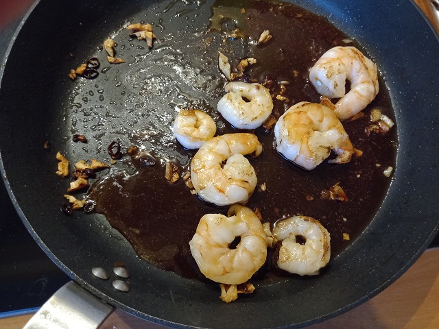 5. Verhit de rest van de olijfolie en bak de garnalen op middelhoog vuur aan beide zijden tot ze mooi roze zijn. Dit duurt 2 à 3 minuten per zijde. Voeg op het laatst de knoflook en de chilivlokken toe.