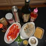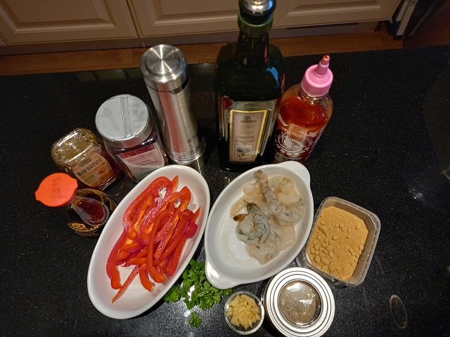 1. Zet alle ingrediënten klaar. Maak de paprika schoon en snijd in reepjes. Pel en snipper de knoflook. Snijd de peterselie fijn.