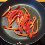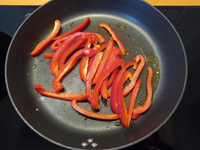 4. Verhit in een koekenpan 1 el. olijfolie en bak de paprikareepjes tot deze zacht zijn. Dit duurt zo'n 5 tot 10 minuten. Haal de paprika uit de pan en bewaar op een bordje.