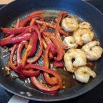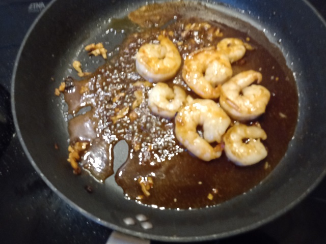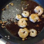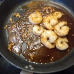 6. Voeg de saus toe en roer de garnalen erdoor zodat de garnalen bedekt worden met de saus.