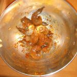 Marineer de garnalen in de helft van de sjalot en knoflook. Voeg er de helft van het paprikapoeder, de helft van de kerrypoeder en het snufje cayennepeper. Meng het geheel goed door elkaar.