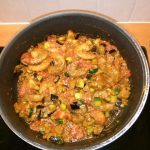 Verhit in een hapjespan de olijfolie en fruit de rest van de sjalot en knoflook. Voeg de rest van de kruiden (paprika, kerry, kurkuma, komijn en kardamon) toe. Laat op niet te hoog vuur even meebakken zodat de kruiden hun smaak kunnen vrijgeven. Voeg de groenten toe en laat deze even meebakken.