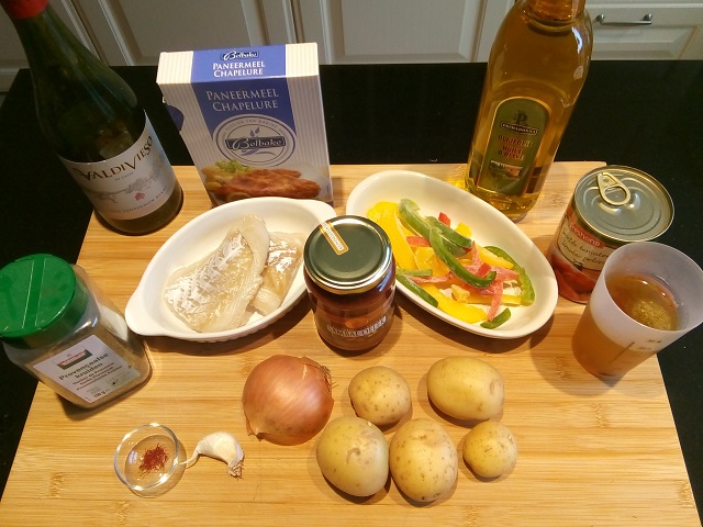 3. Bedek de bodem van een ovenschaal met de plakjes aardappel. Verdeel hierover de uien met de reepjes paprika en de knoflook. Strooi hier wat Provençaalse kruiden over. Trek met twee vorken de kabeljauw in stukjes. Verdeel dit over het mengsel in de ovenschaal. Voeg de witte wijn en de bouillon toe. Meng in een kom de tomatenblokjes met de sambal, saffraan en 2 el olijfolie. Verdeel dit over de kabeljauw.