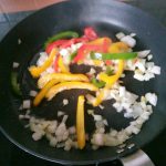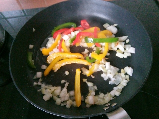 1. Zet alle ingrediënten klaar. Pel en snipper de ui. Snijd de paprika's in reepjes. Schil de aardappelen. Kneus de knoflook door deze plat te drukken met de zijkant van een koksmes.