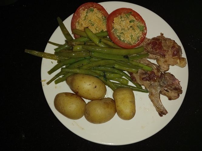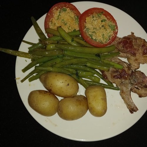Verdeel de koteletten, tomaten, krieltjes en bonen over de borden en serveer.