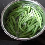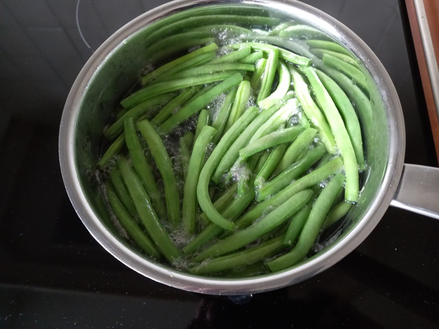 Maak de boontjes schoon en blancheer ze in licht gezouten water. Spoel ze koud en laat uitlekken in een vergiet.