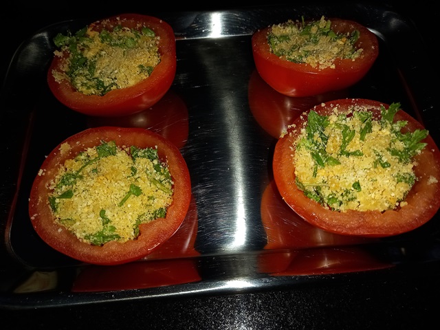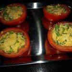 Verwarm de oven voor op 180℃. Meng in een kommetje 1 el peterselie, 2 el paneermeel, 1 tl Provençaalse kruiden en een fijn gesneden teentje knoflook. Snijd de tomaten horizontaal doormidden. Verwijder de zaadlijsten. Vul ze met het mengsel. Leg ze op een ovenplaatje.