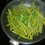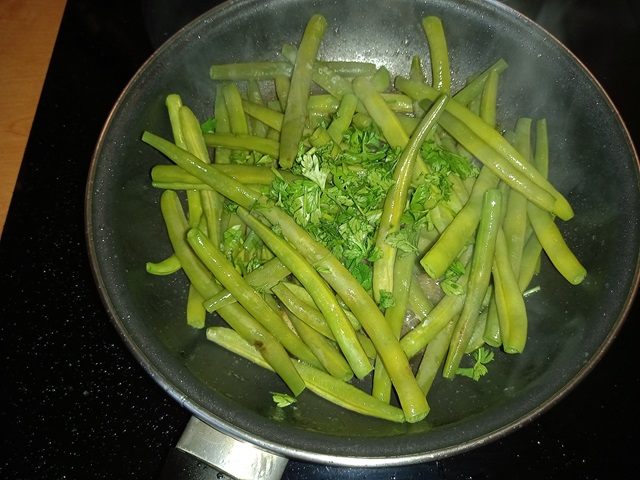 Verhit een koekenpan met een klontje boter en 1 el olijfolie. Voeg de boontjes toe met 1 el peterselie, een fijn gesneden teentje knoflook, 1 tl Provençaalse kruiden, zout en wat peper.