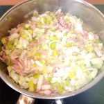 2. Zet een pan op middelhoog vuur met 40 gr. boter. Bak hierin de spekjes en de prei. Voeg een beetje zout en peper toe. Giet de kippenbouillon toe en laat zachtjes koken tot het vocht verdampt is.