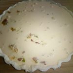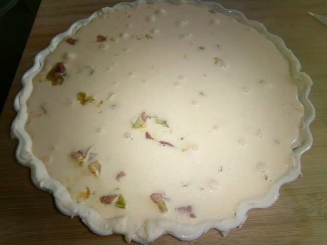 4. Smeer de (taart) vorm in met wat boter. Rol in de vorm het bladerdeeg uit. Verdeel het spek-prei mengsel gelijkmatig in de vorm. Giet het crème fraïche over het mengsel.