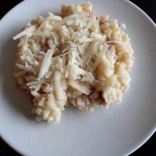 Verdeel de risotto over de borden en garneer met de vlokken kaas,