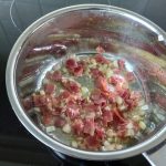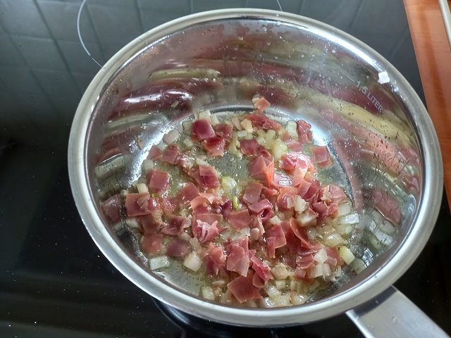 Fruit het sjalotje aan in de boter en de olijfolie. Voeg ook de fijngesneden ham toe.