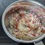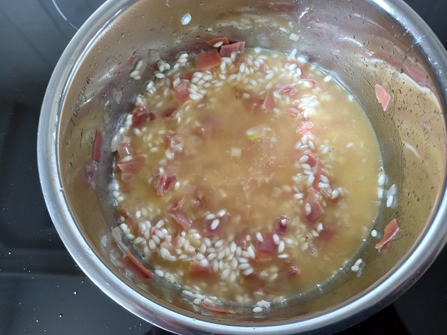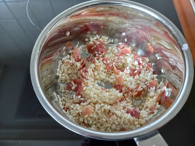 Als de ui glazig is, voeg dan de rijst toe. Roer tot alle korrels glimmen en glazig beginnen te worden.
