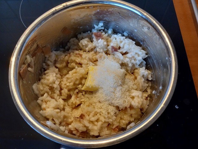 Roer de 40 gr. boter en de geraspte kaas door de rijst.
