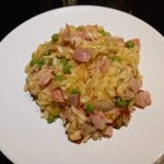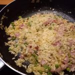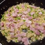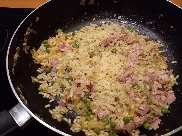 Roer het geheel door elkaar en proef. Is de rijst nog niet helemaal gaar voeg dan nog een klein beetje water toe.. Voeg de Parmezaanse kaas toe en roer door elkaar.