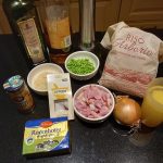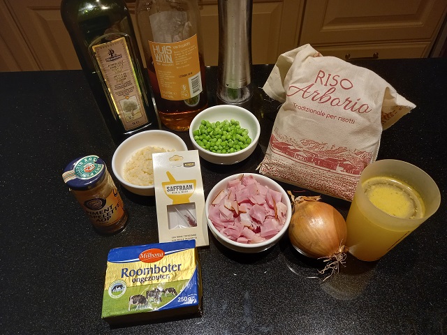 Zet alle ingrediënten klaar. Pel en snipper de ui. Snijd de ham in stukjes.
