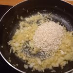 Verhit de boter en olie in een hapjespan en fruit de ui tot hij glazig ziet. Voeg dan de risotto rijst toe. Roer goed door elkaar. Laat even bakken totdat ook de rijst glazig ziet. Voeg dan de witte wijn toe. Laat sudderen totdat de rijst alle wijn heeft opgenomen. Voeg dan een scheutje bouillon toe. Ga hiermee verder tot je op ongeveer 3/4 van de bouillon bent.