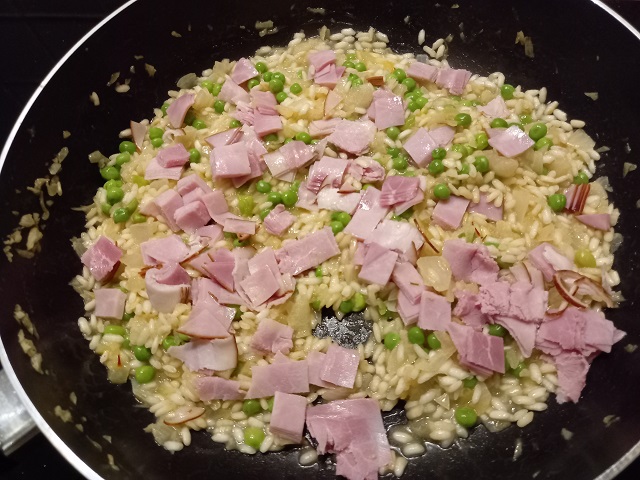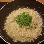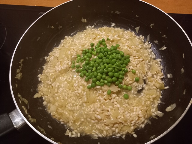 Voeg dan de doperwten toe. Voeg een beetje zout en een snufje piment toe. Ga hiermee verder tot alle bouillon is opgenomen door de rijst.