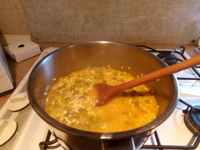 Smelt de boter in een pan en voeg de olijfolie toe. Fruit de ui. Voeg de rijst toe en laat deze glazig worden in de boter en de olie. Blus af met de witte wijn. Zodra de wijn is opgenomen door de rijst voeg je beetje bij beetje de bouillon toe. Breng na ongeveer 15 minuten wat zout, piment d’espelette en de doperwten toe.