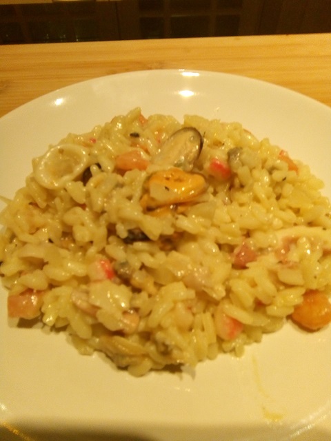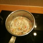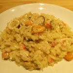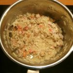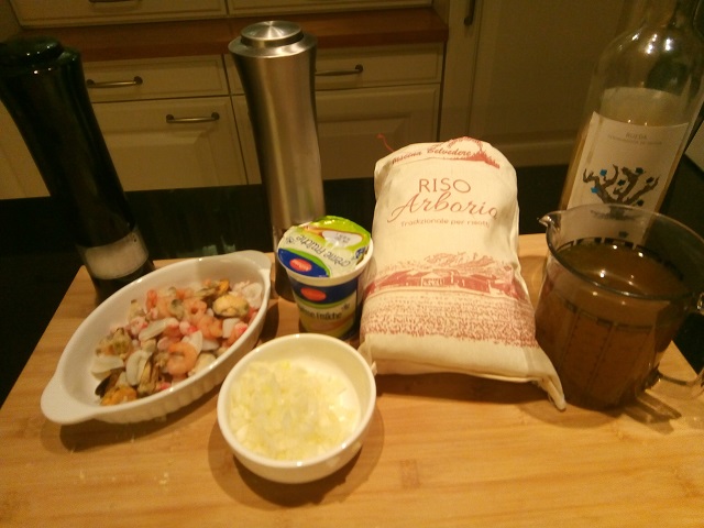 3. Verwarm een klontje boter in een steelpan. Fruit de ui tot hij glazig is. Voeg de zeevruchten toe. Laat een minuutje aanfruiten. Voeg dan de wijn toe. Laat inkoken tot de wijn geheel verdwenen is. Voeg dan de risottorijst toe en de crème fraîche. Meng goed door elkaar en breng op smaak met zout en peper.