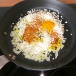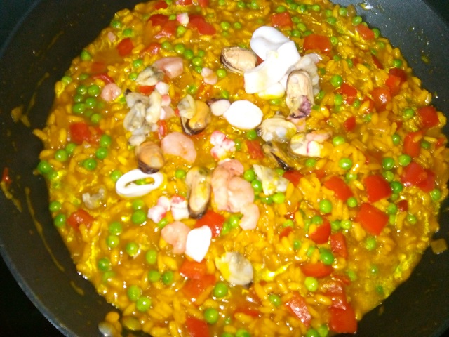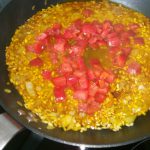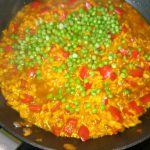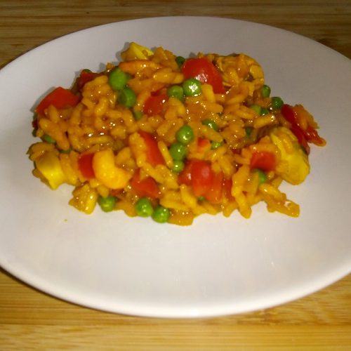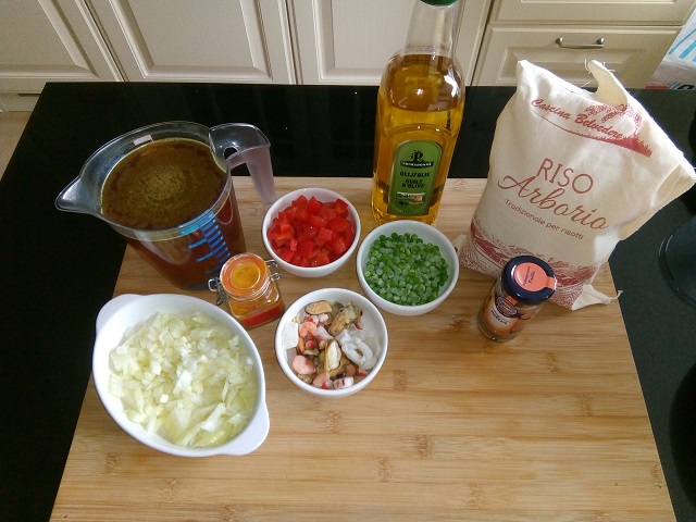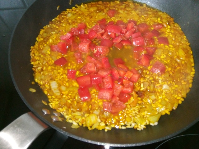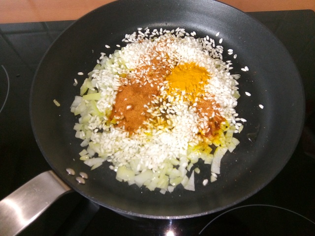 Verhit de olie op middelhoog vuur en fruit de ui glazig. Voeg de risotto rijst, paella kruiden en de kurkuma toe. Roer goed door elkaar en verhit nog 3 minuten.