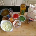 Zet alle ingrediënten klaar. Maak de paprika schoon en snijd deze eerst in repen en dan in blokjes. Pel en snipper de ui. Verwarm de bouillon.