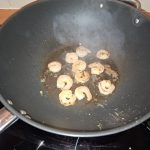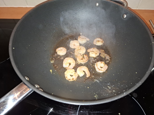 Verhit in een wok de olie en bak de garnalen samen met de helft van de knoflook. Keer na 1½-2minuten de garnalen en bak nog een minuut. Haal de garnalen uit de wok en bewaar onder aluminiumfolie.
