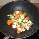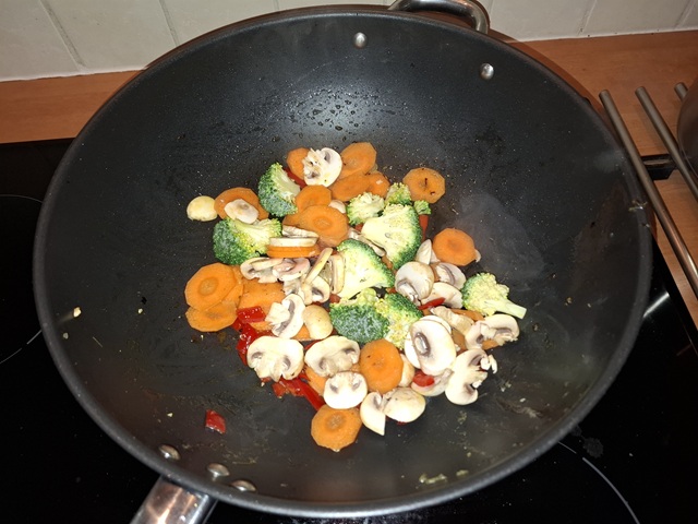 Voeg eventueel nog een beetje olie toe en voeg alle groenten toe. Doe een deksel op de wok zodat de groenten in hun eigen stoom kunnen garen.
