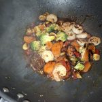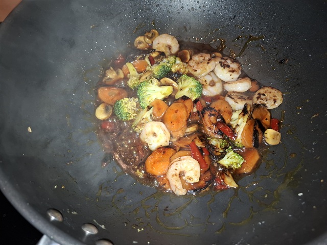 Nadat de groenten een minuut of 5 hebben gekookt voeg dan de saus toe en laat even zachtjes koken zodat de saus dikker wordt met het deksel op de pan.. Roer regelmatig. Als de groenten gaar zijn kunnen de garnalen terug in de pan. Laat nog even goed doorwarmen.
