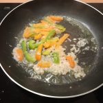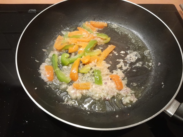 2. Smelt de boter in een ruime koekenpan en fruit de sjalot. Voeg na 2 minuten de paprikablokjes toe. Laat in totaal 5 minuten zachtjes bakken.