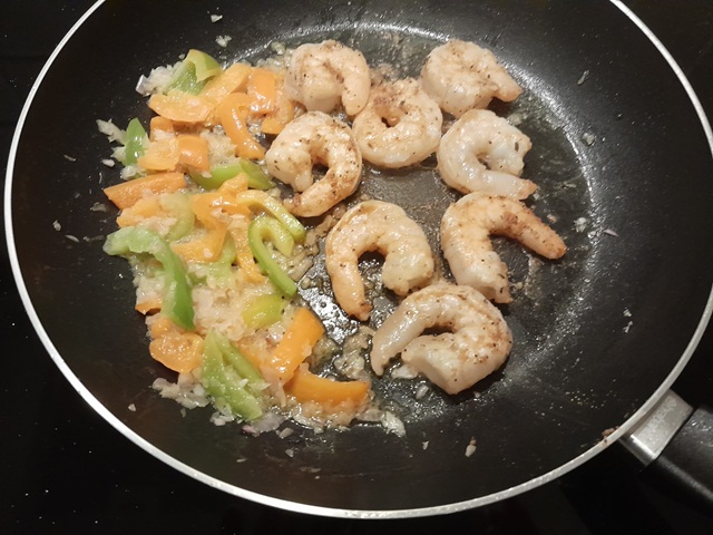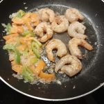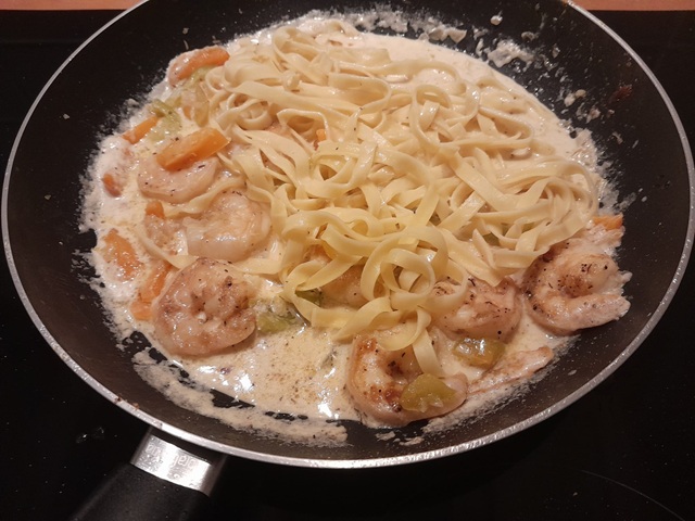 7. Voeg het garnalen mengsel en de gekookte pasta toe. Meng goed door elkaar.