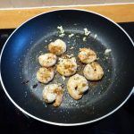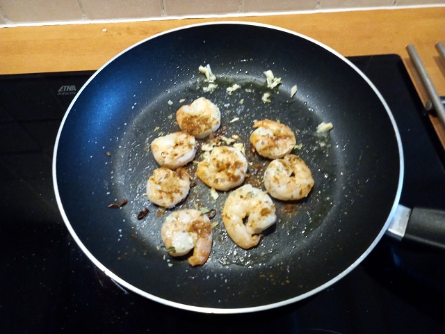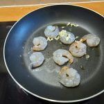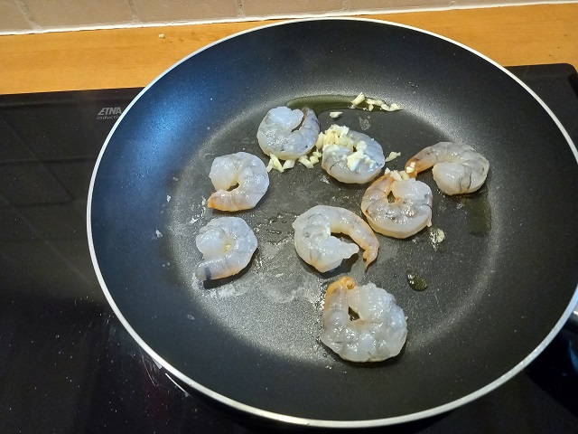 Verhit 1 el olijfolie in een koekenpan en voeg de garnalen toe. Bak een halve minuut en voeg dan de knoflook toe. Bak nog een halve minuut en keer de garnalen dan om.
