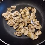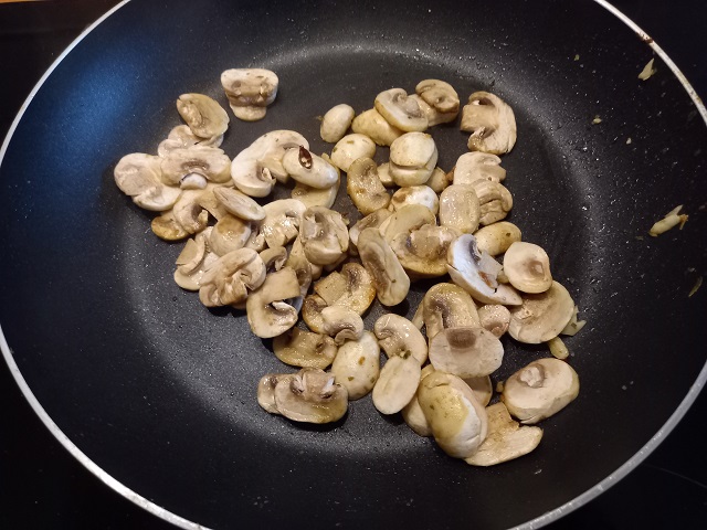 Verhit de andere el. olijfolie in de koekenpan en bak de champignons tot ze wat zachter zijn en een mooi kleurtje hebben> Dit duurt zo'n 2 à 3 minuten.