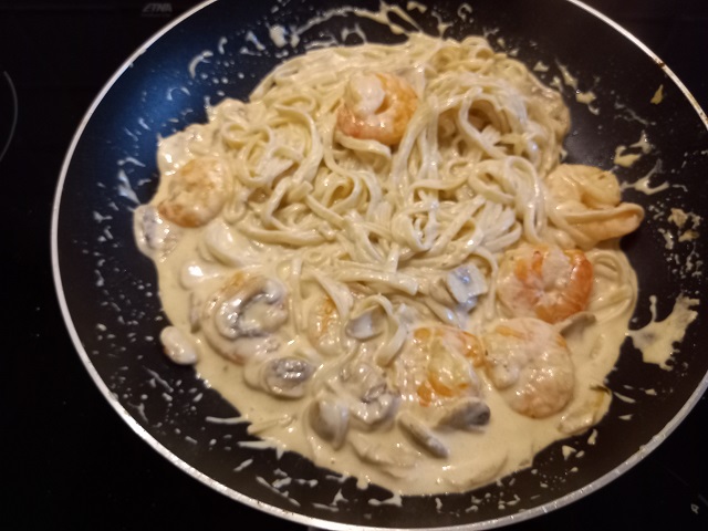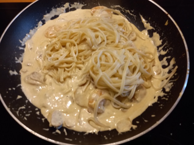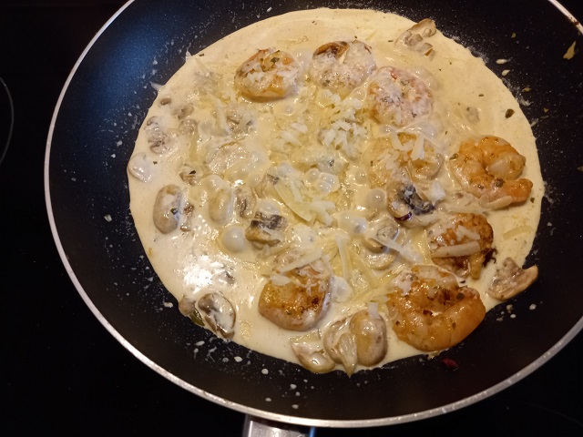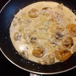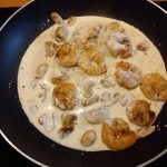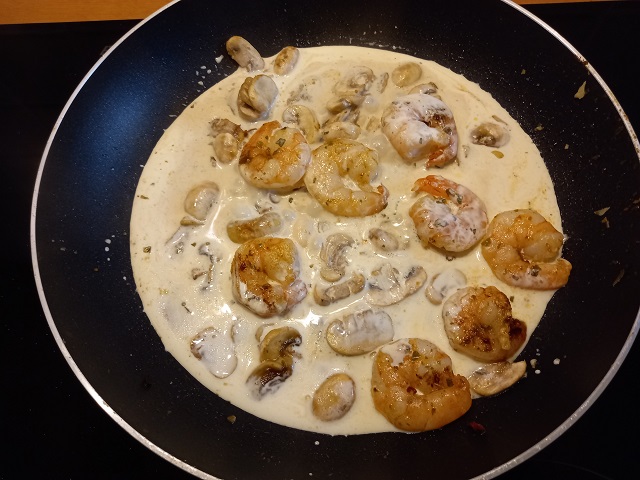 Voeg de garnale toe aan de pan met champignons. Voeg gelijk de kookroom toe. Breng aan de kook. Verlaag daarna de warmtebron tot medium.