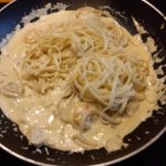 Voeg de helft van de kaas toe en laat dit smelten onder voortdurend roeren. VOeg beetje bij beetje nog wat kaas toe tot de saus de gewenste dikte heeft. Het kan zijn dat je niet alle kaas nodig hebt. Proef de saus en voeg eventueel nog wat zout toe. Indien de saus toch te dik is geworden voeg dan een beetje van het kookvocht van de pasta toe.