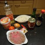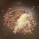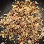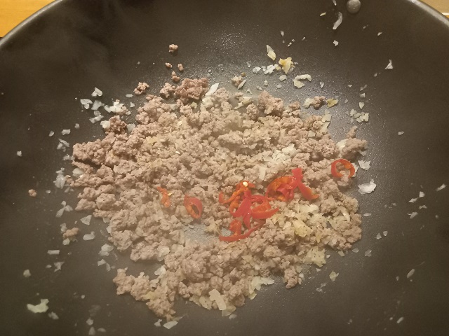 Verhit een wok met de olie en rul het gehakt 4-5 minuten zodat ze iets knapperig wordt. Voeg de ui toe en bak deze mee tot deze glazig is.
