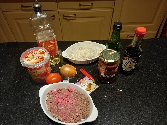 Zet alle ingrediënten klaar. Pel en snipper de ui en knoflook. Snij de rode peper in de lengte open. Verwijder de zaadjes en e zaadlijsten. Snij in kleine stukjes. Snij de tomaat in plakjes.