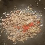 Voeg dan de knoflook en de rode peper toe en roerbak deze een minuutje mee.