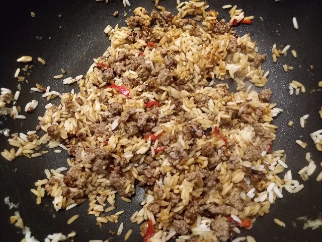 Schuif de inhoud van de wok naar 1 kant en giet de tl olie op de lege plek. Voeg de trassi toe in de olie zodat deze kan oplossen. Meng het geheel door elkaar. Verkruimel het bouillonblokje boven de wok. Voeg de gekookte rijst, sojasaus en de ketjap manis toe. Meng het geheel door elkaar en wok tot de rijst gebakken is en warm.