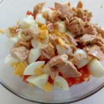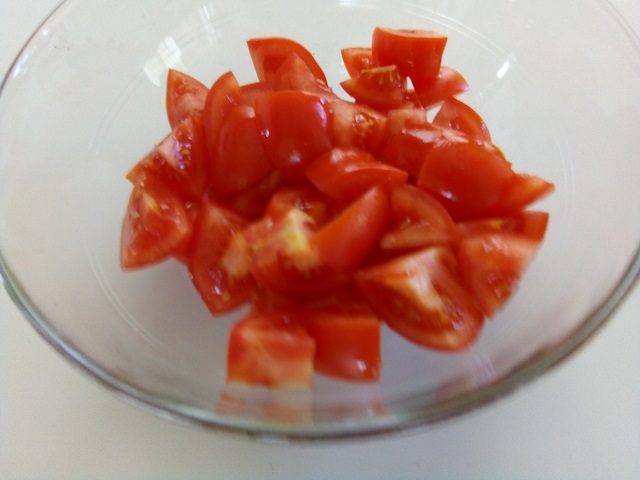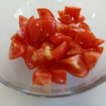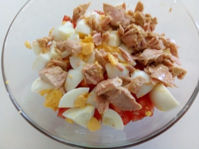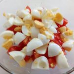 Pel de eieren en snijd deze in blokjes en doe deze bij de tomatenblokjes.